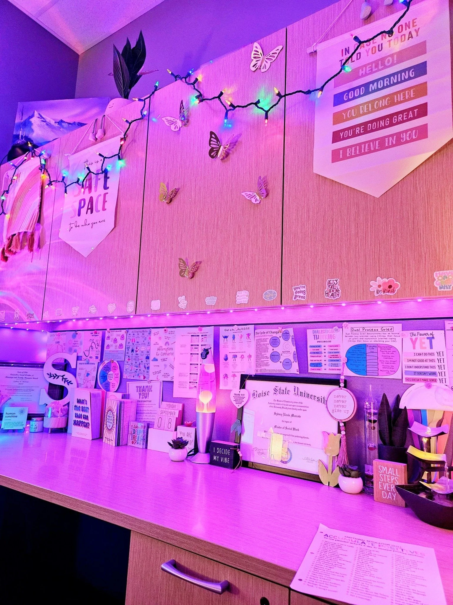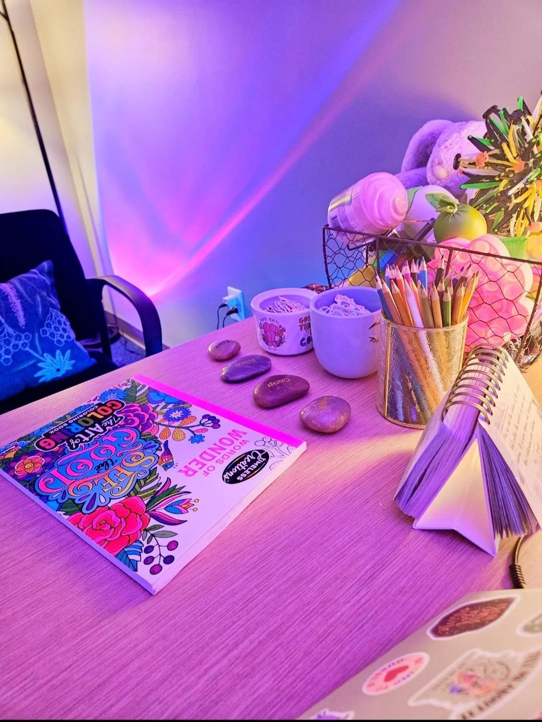 Stepping into my office, you’ll find a space designed to feel calm, comfortable, and welcoming. Finally, a place where you can truly exhale. Every detail was chosen with intention, from the soft lighting and cozy seating to the shelves of books and games that invite curiosity and connection.